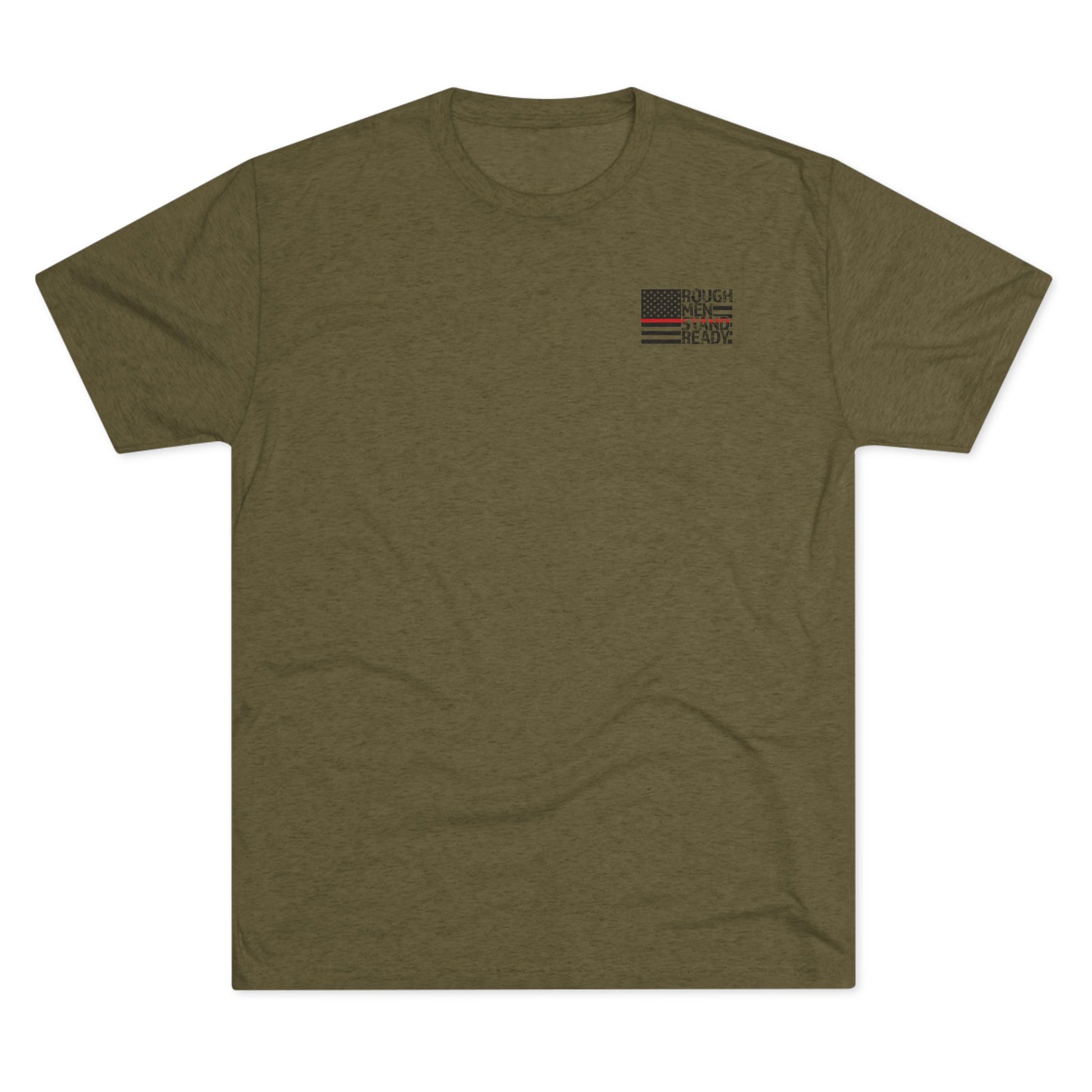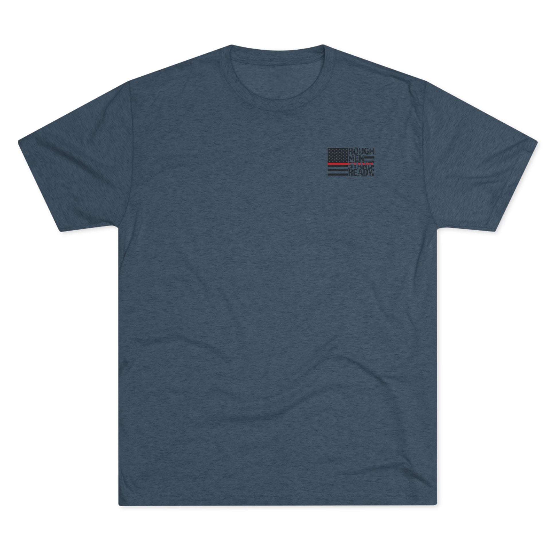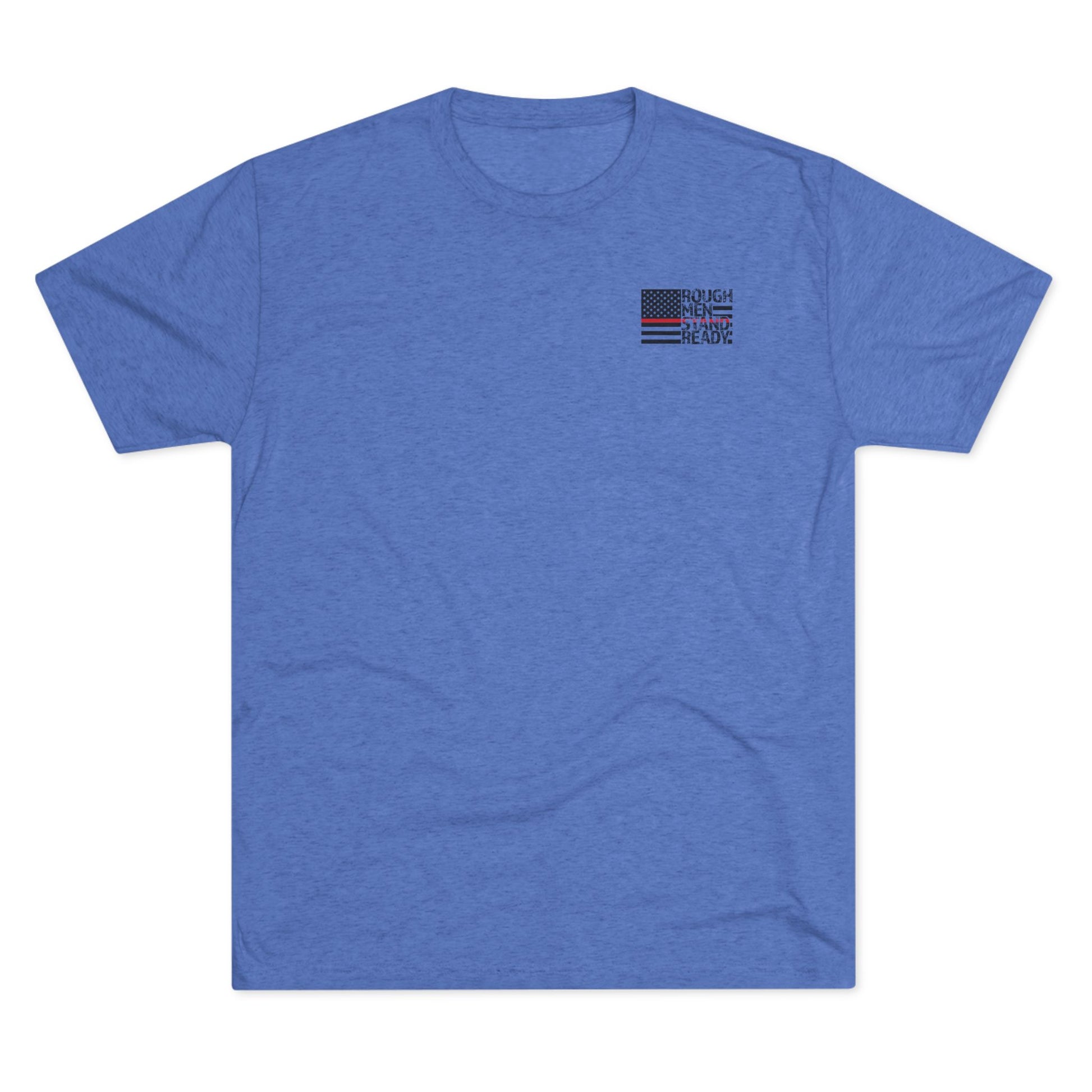 Rough Men Stand Ready™ logo on front with the red line integrated into the flag. The phrase worked into the graphic for the back print. The unisex triblend crew tee is made of soft triblend fabric, making it extremely comfortable, but we do recommend going up a size for a looser fit than usually worn if in-between sizes.