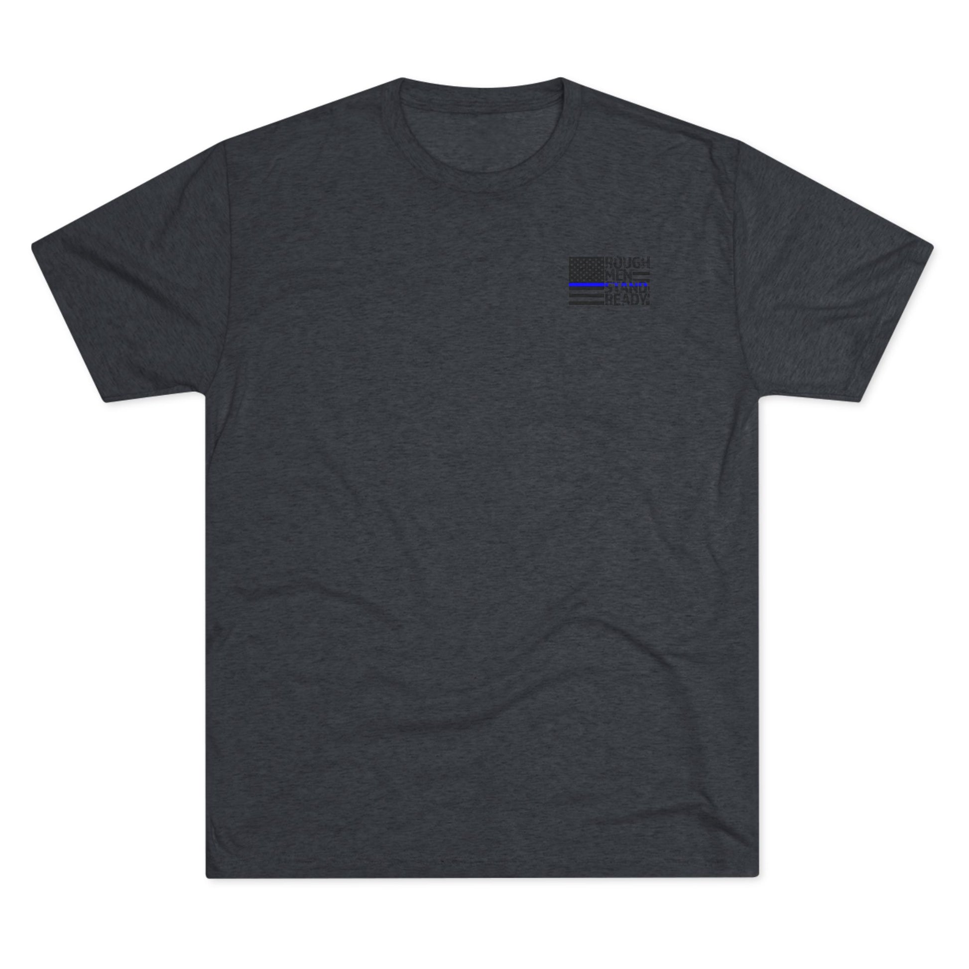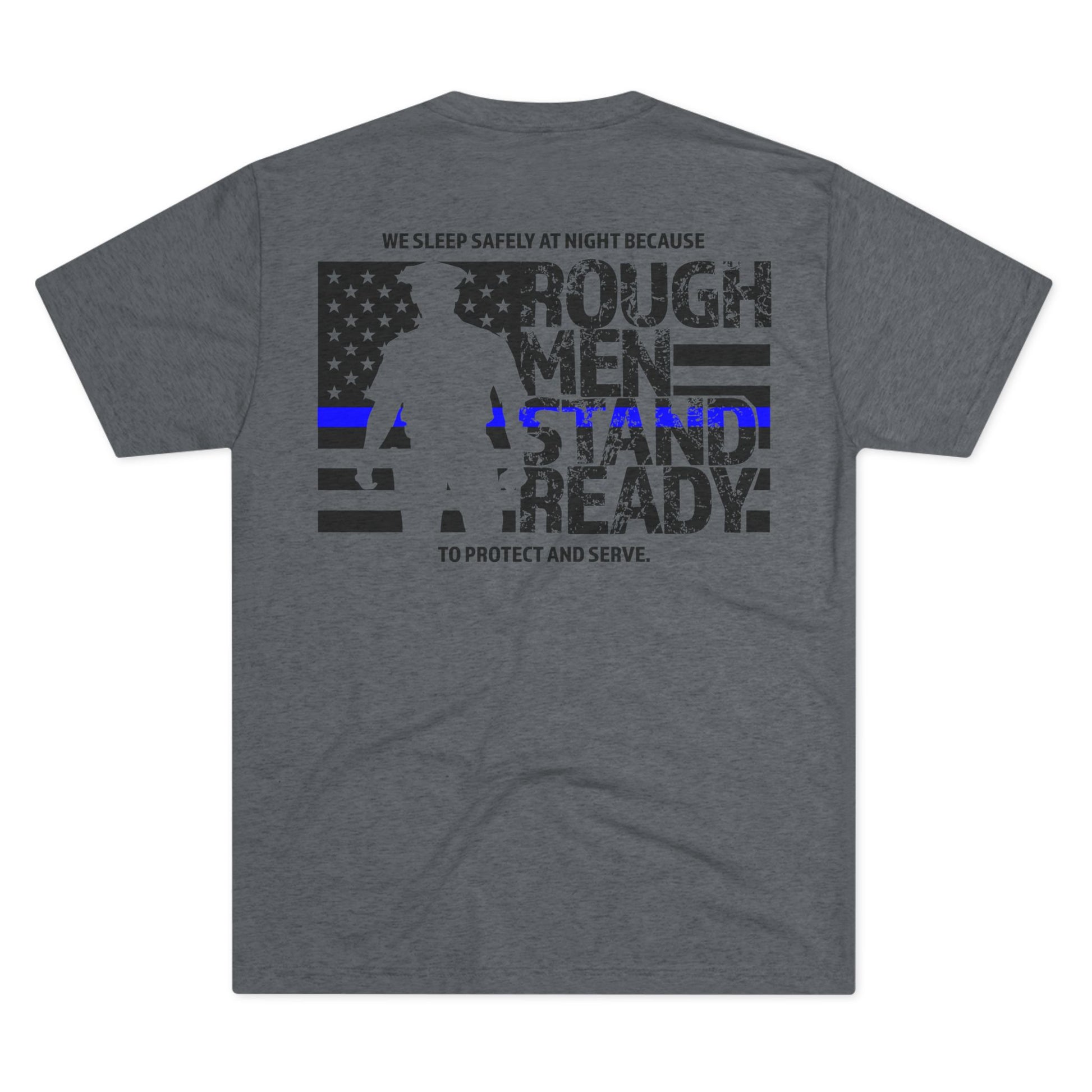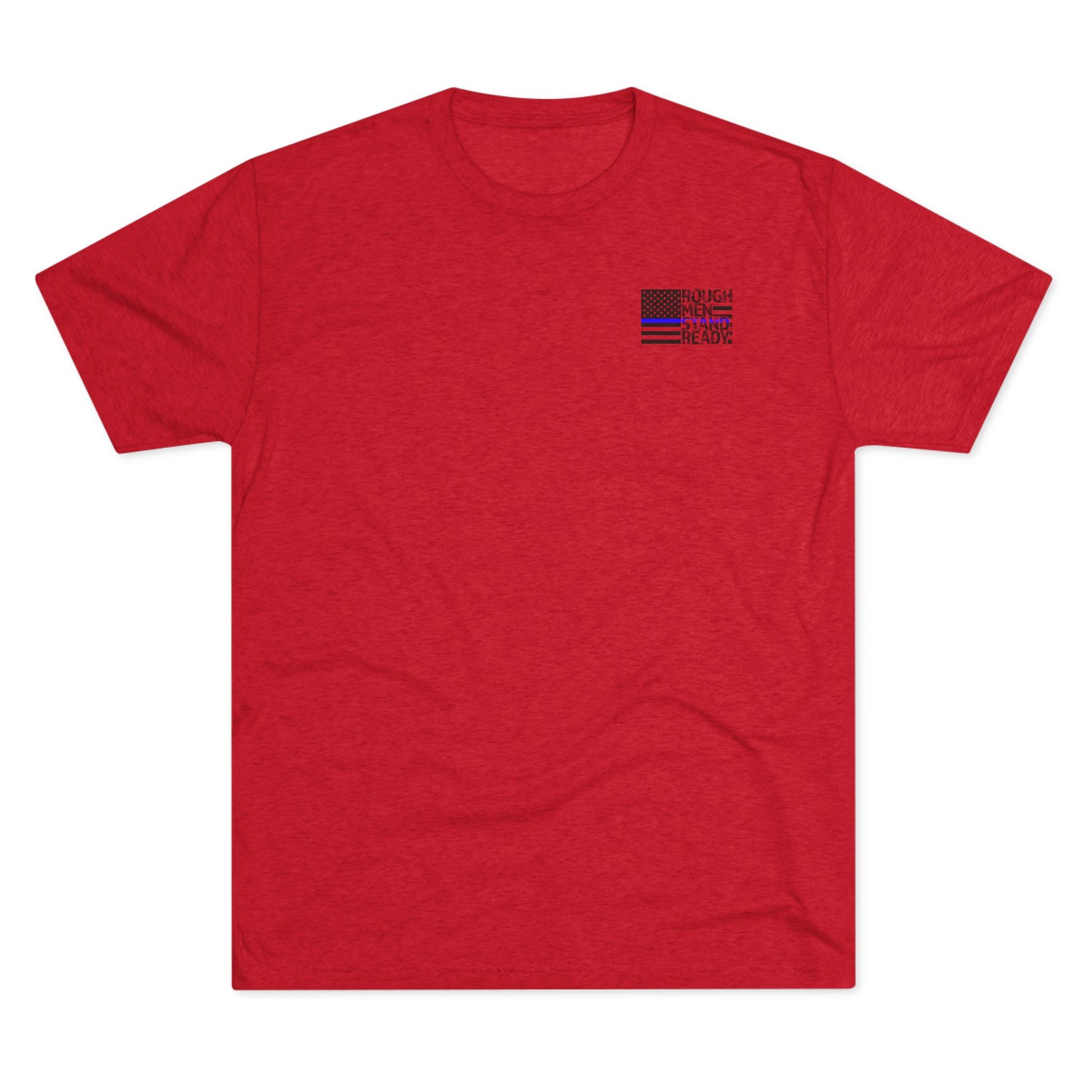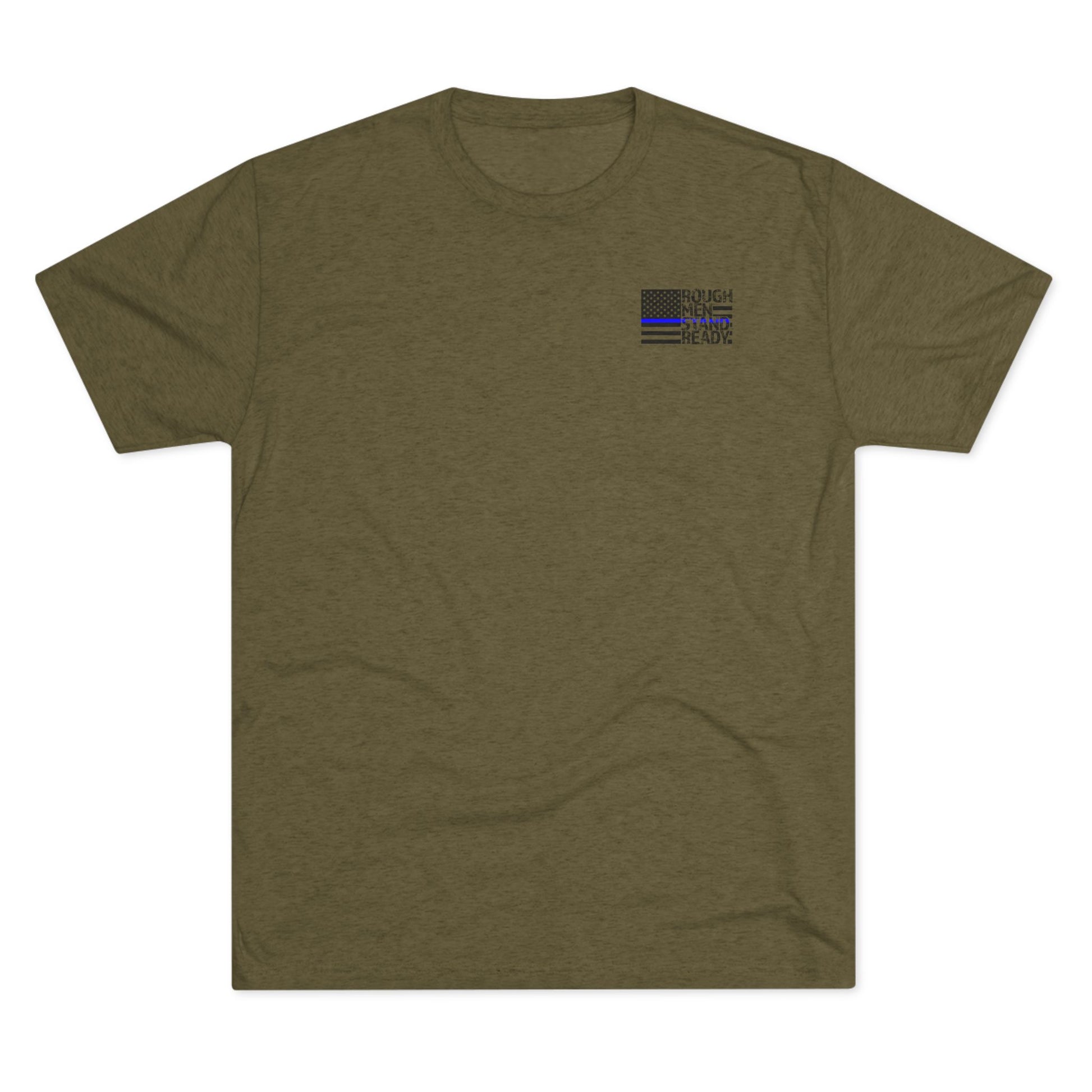 Rough Men Stand Ready™ logo on front with the blue line. The full phrase worked into the graphics on the back. The unisex triblend crew tee is made of soft triblend fabric, making it extremely comfortable, but we do recommend going up a size for a looser fit than usually worn if in-between sizes.