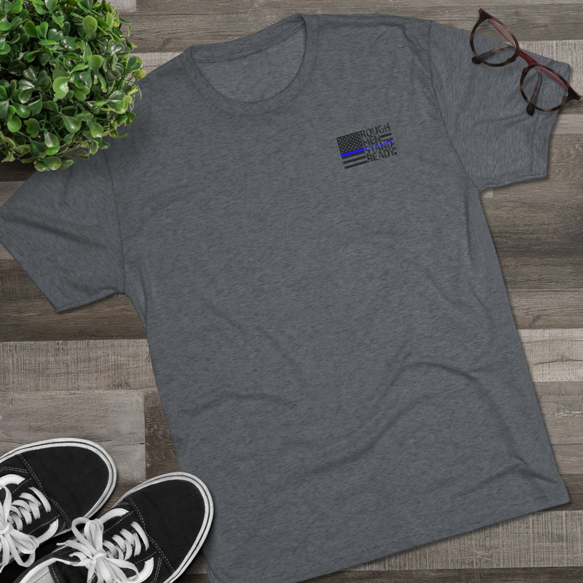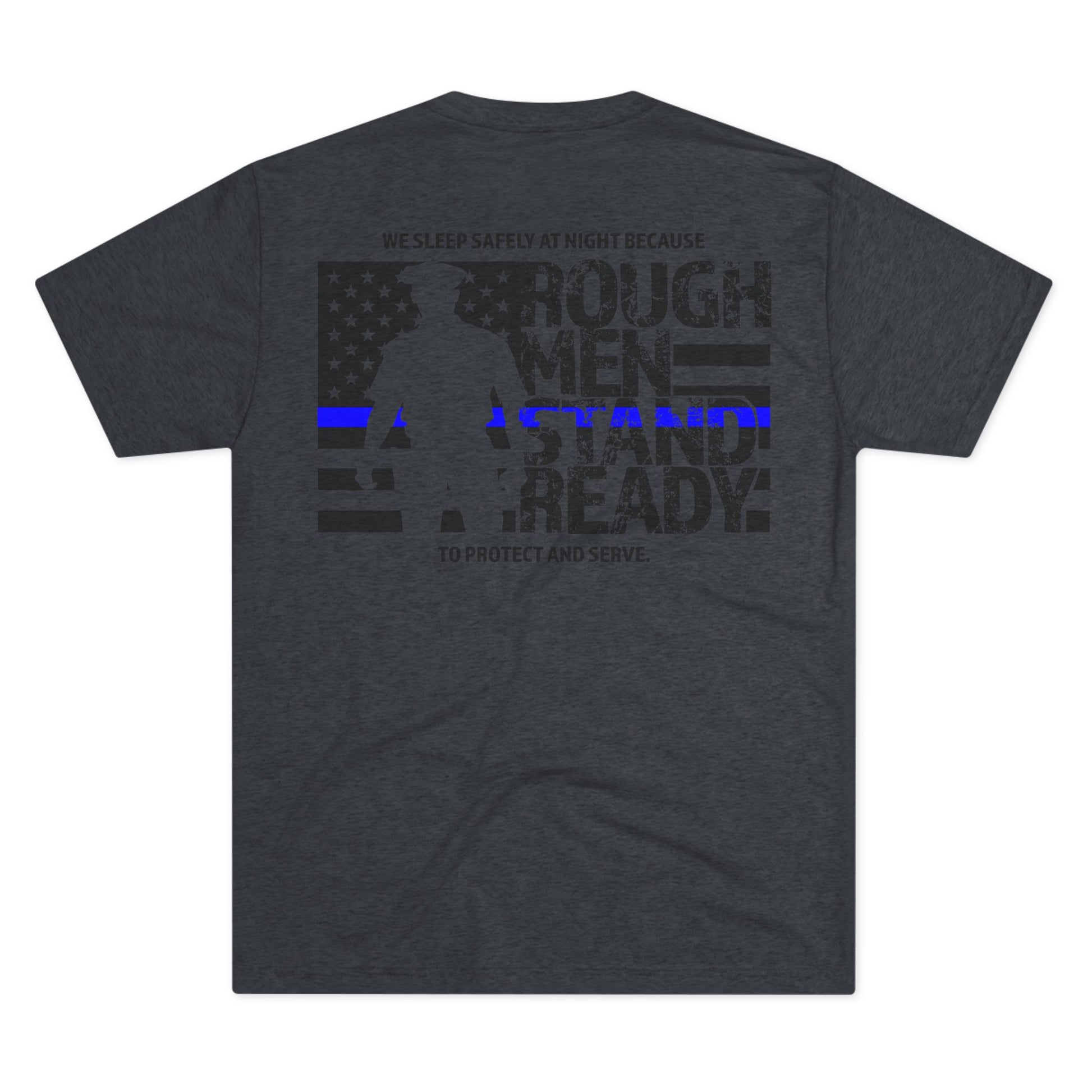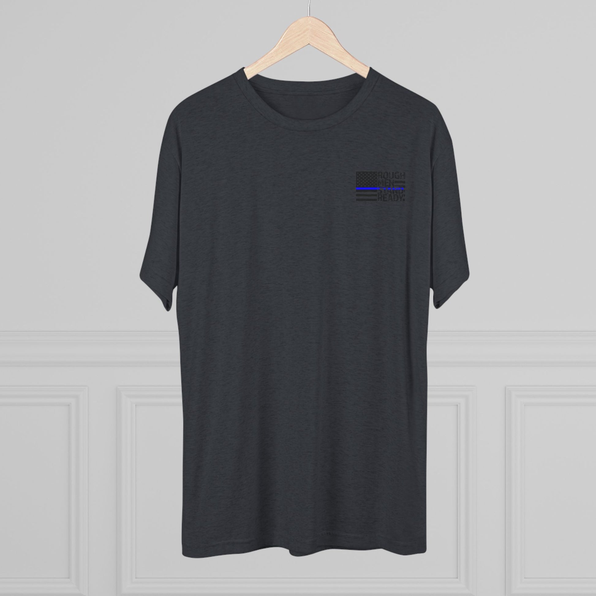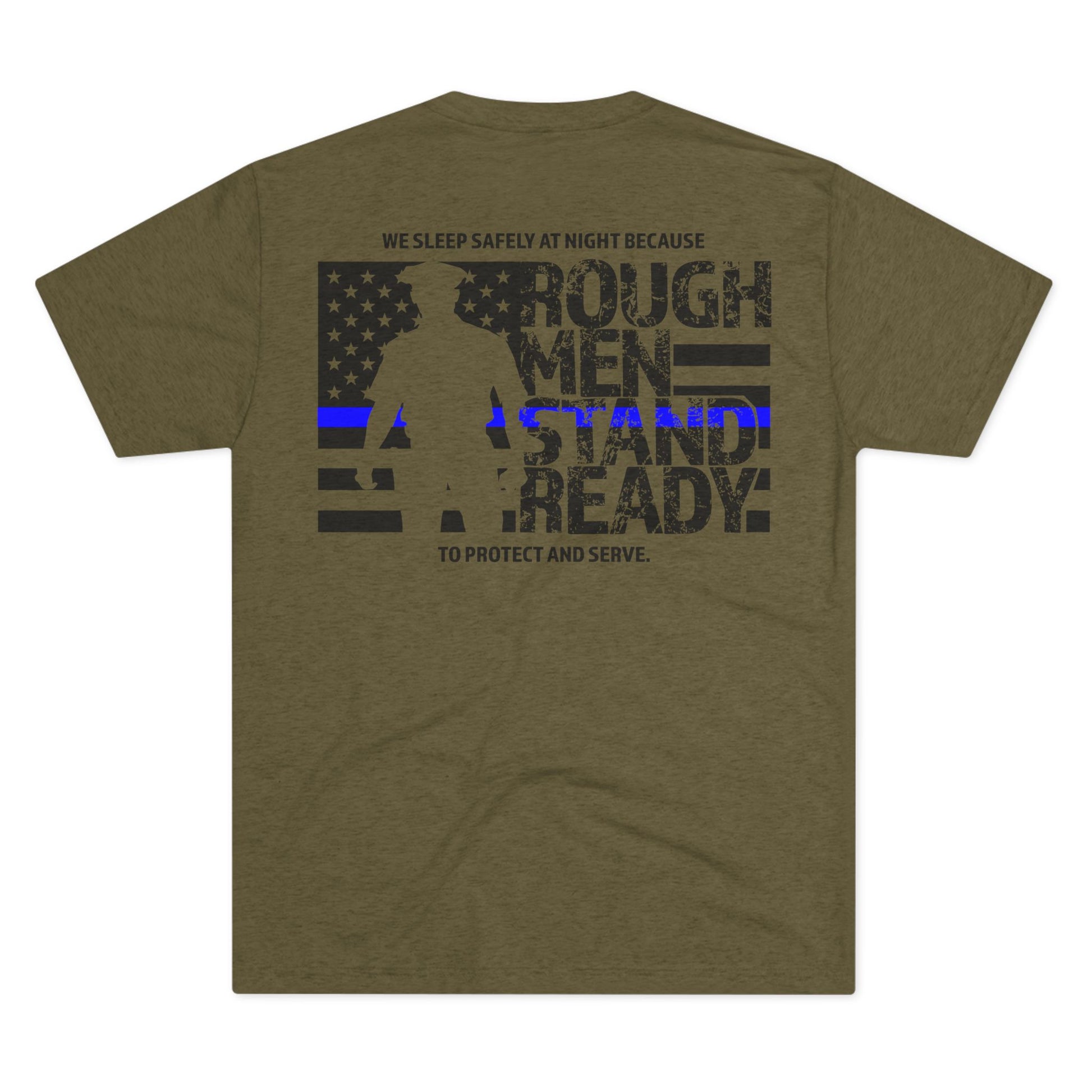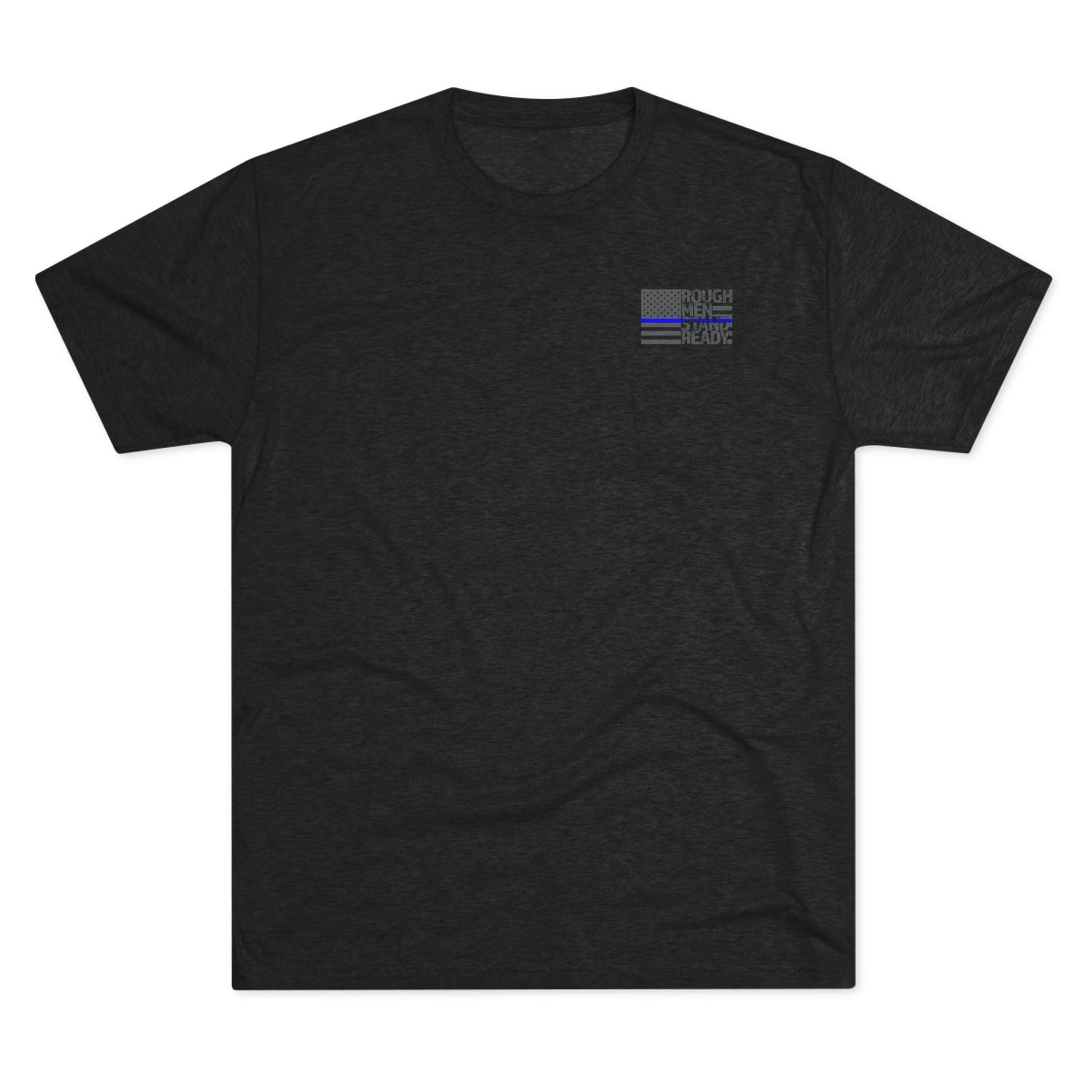 Rough Men Stand Ready™ logo on front with the blue line. The full phrase worked into the graphics on the back. The unisex triblend crew tee is made of soft triblend fabric, making it extremely comfortable, but we do recommend going up a size for a looser fit than usually worn if in-between sizes.