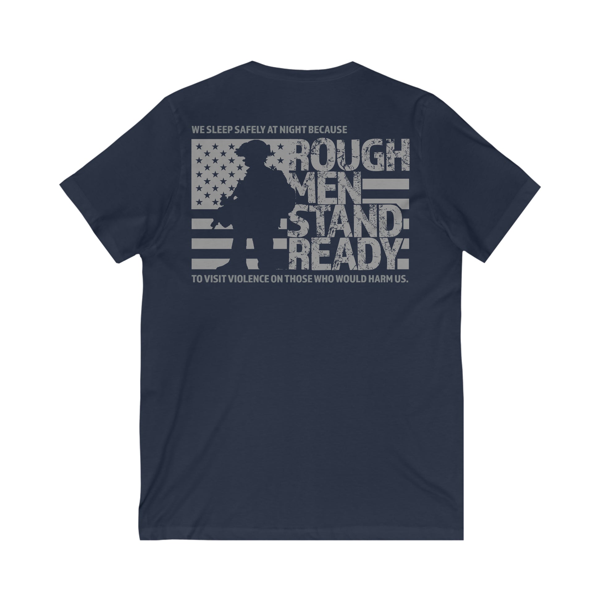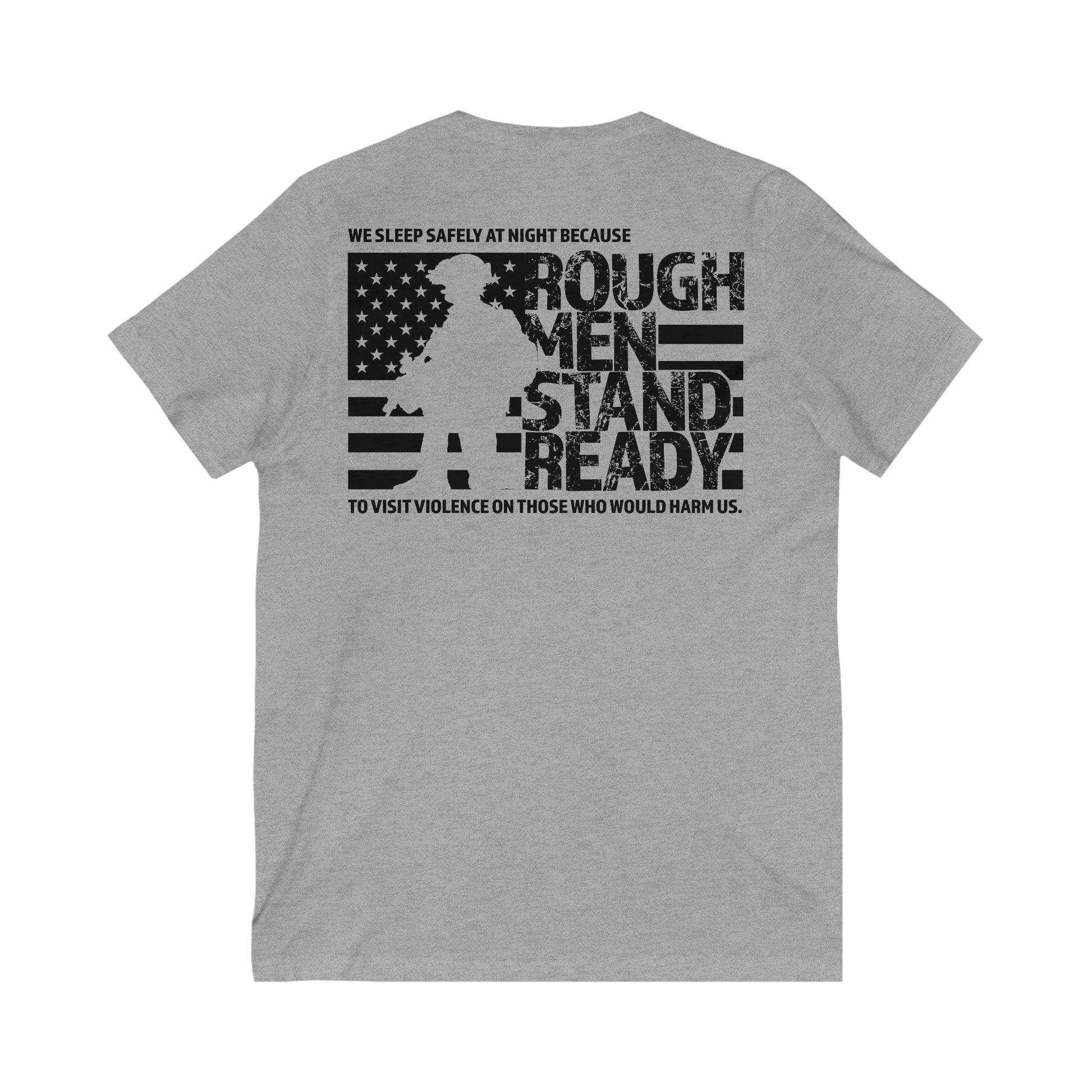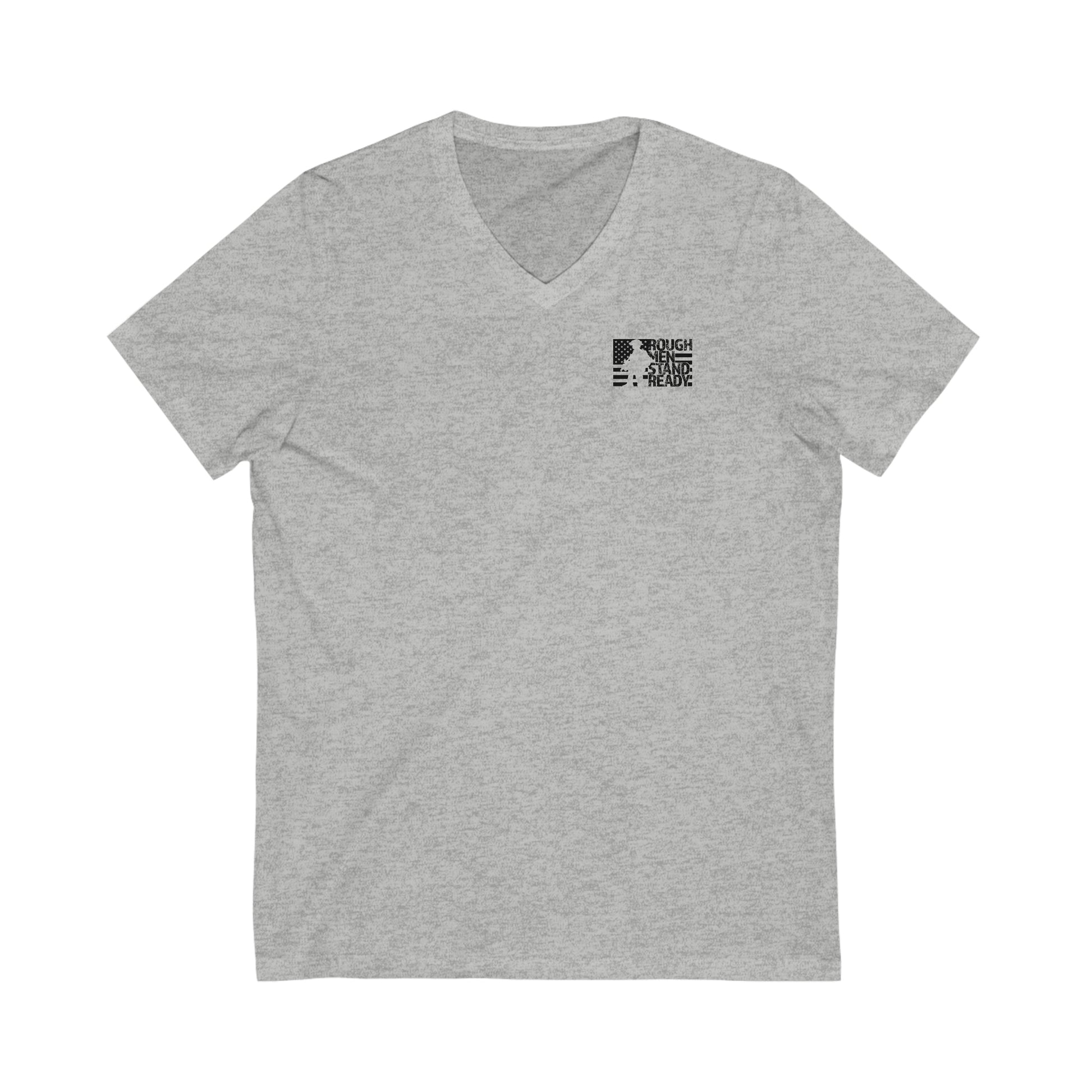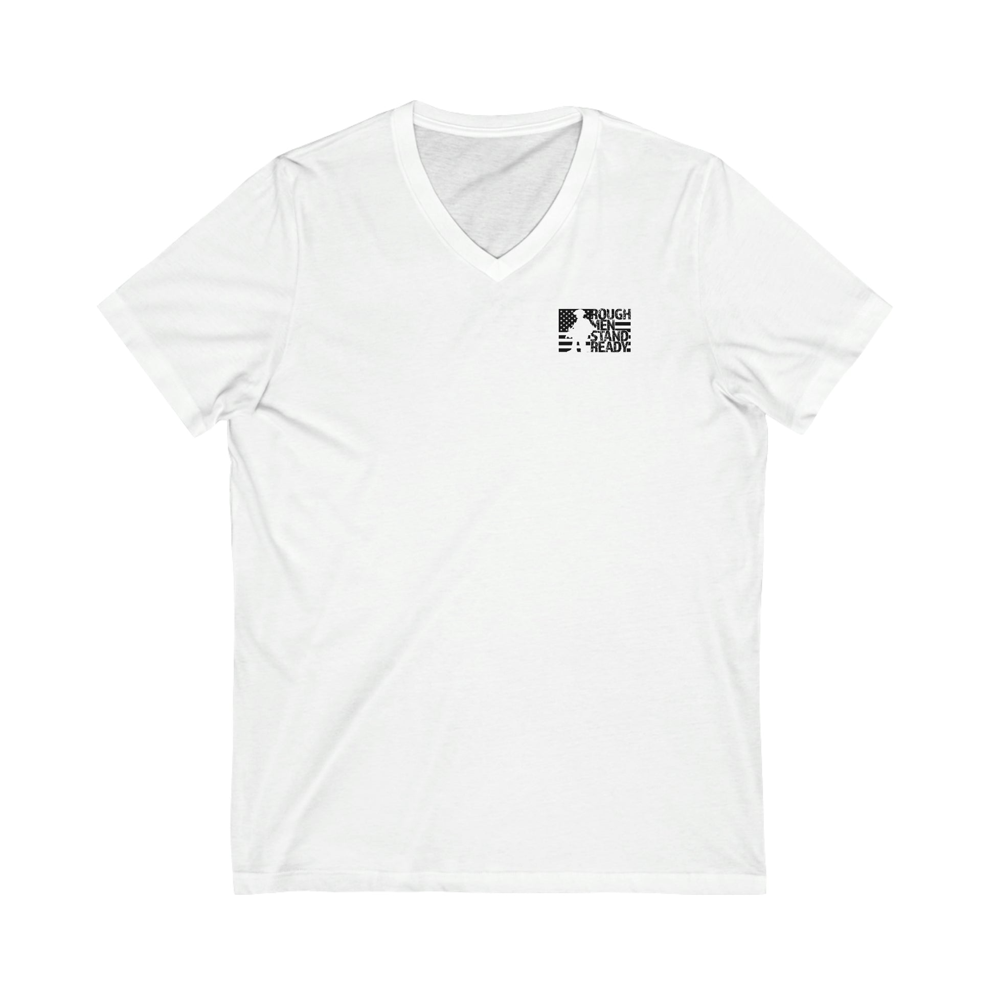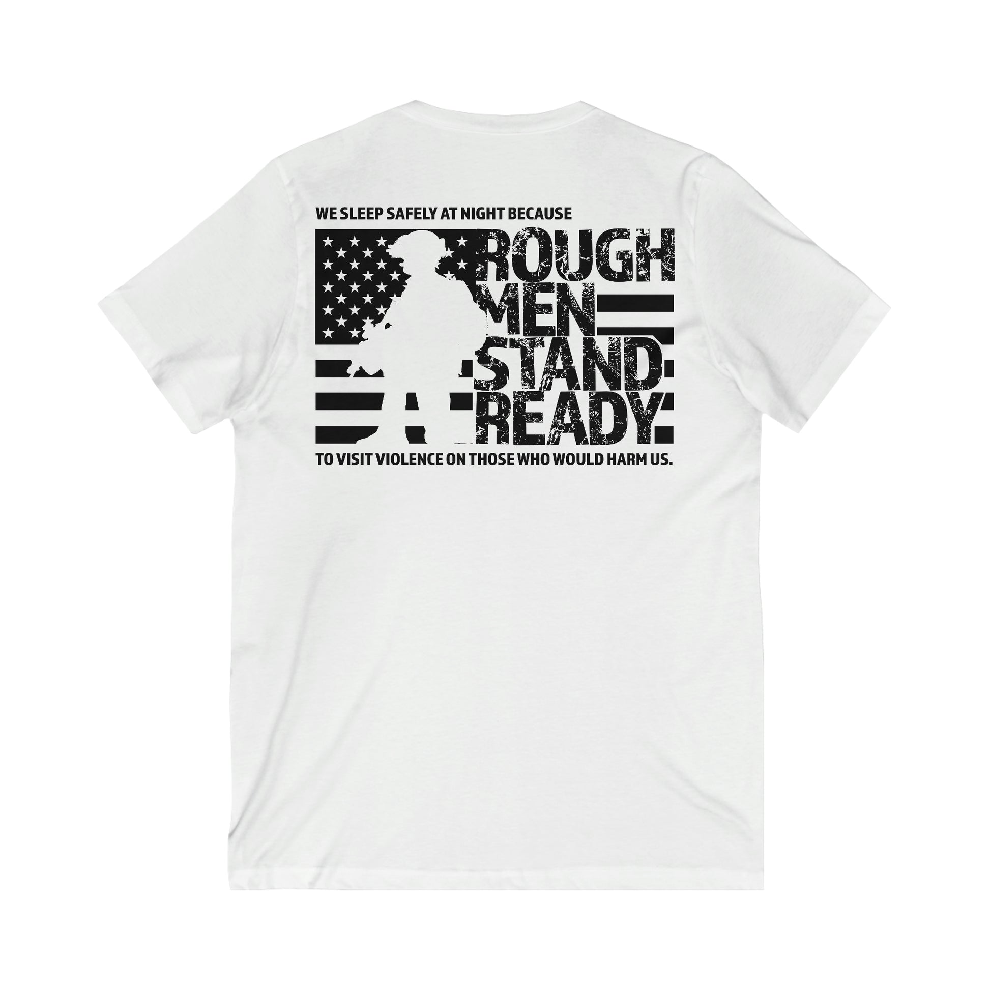 Rough Men Stand Ready™ logo on front. The full phrase worked into the graphics on the back. The unisex cotton v-neck tee is made of soft lightweight fabric, making it extremely comfortable, but we do recommend going up a size for a looser fit than usually worn if in-between sizes.