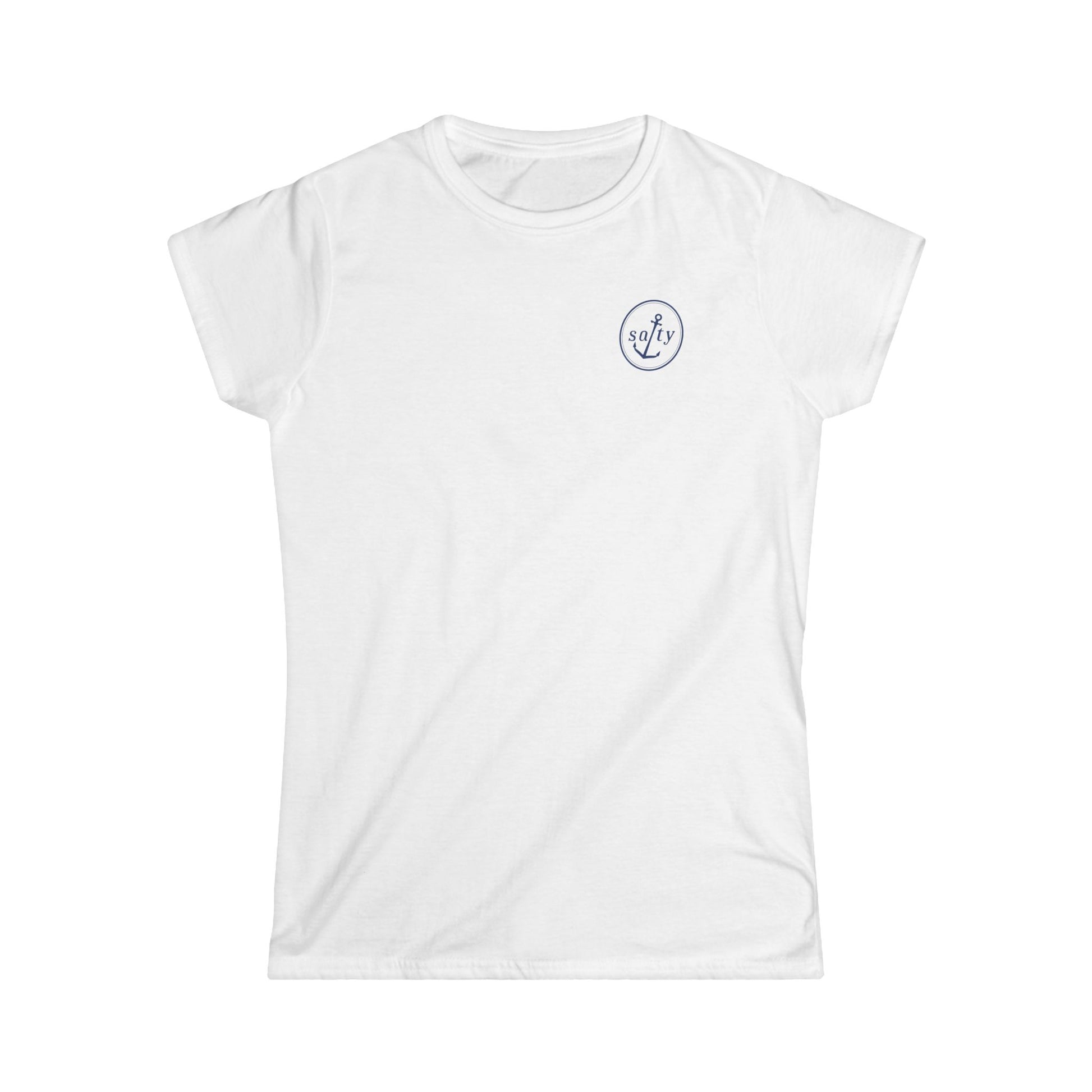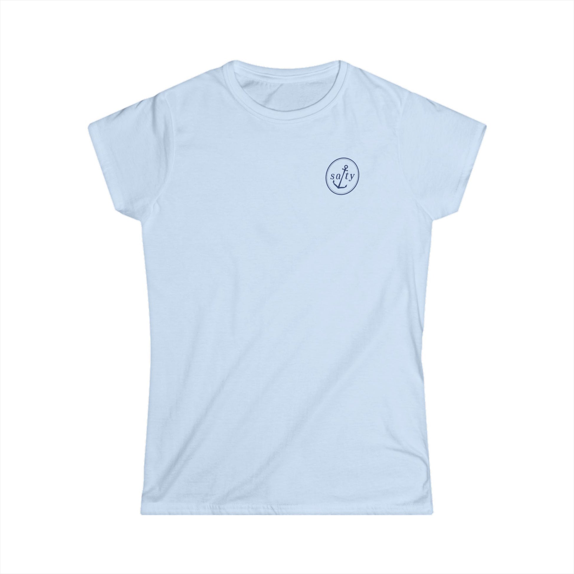 From our Salty™ line, the nautical aesthetic flavors up a v-neck tee with a Salty™ logo applied on the front chest for a coastal classic. The v-neck tee is made of soft, lightweight cotton fabric, making it extremely comfortable and breathable, but we do recommend going up a size for a looser fit than usually worn if in-between sizes. The woman's softstyle tee is a more feminine take on the classic tee. The sleeves are shortened to reveal some shoulder. The fabric is 100% ringspun cotton for all solid colors. The shoulders are taped with twill to prolong durability. The collar seam is reinforced with ribbed knitting.